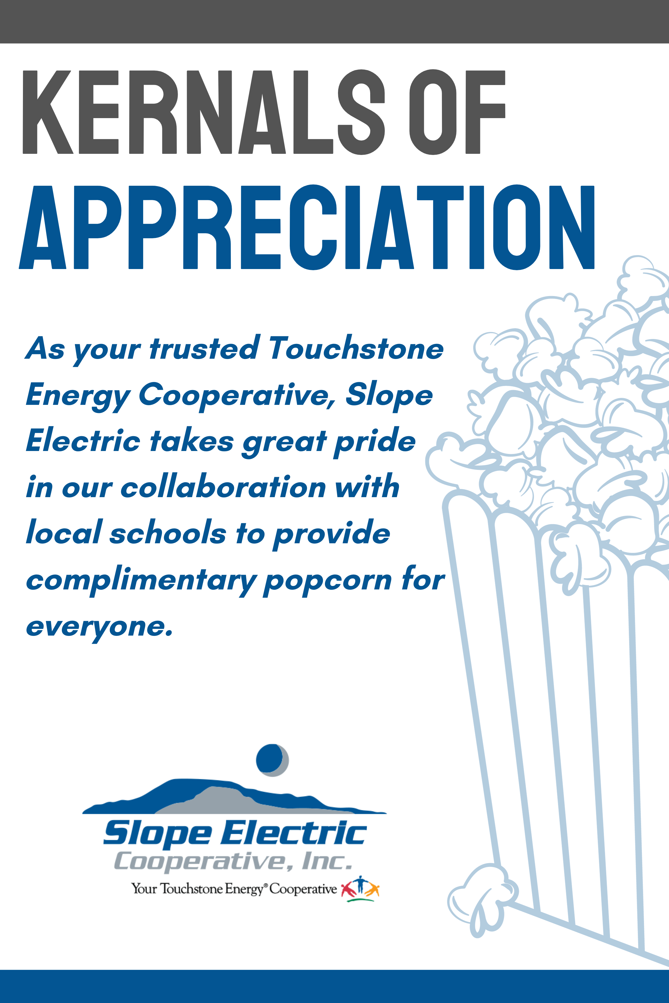 As your trusted Touchstone Energy Cooperative, Slope Electric takes great pride in collaborating with Bowman County Public School to provide complimentary popcorn for everyone at the concession stand this evening.” (kernals_of_1.png) | ||